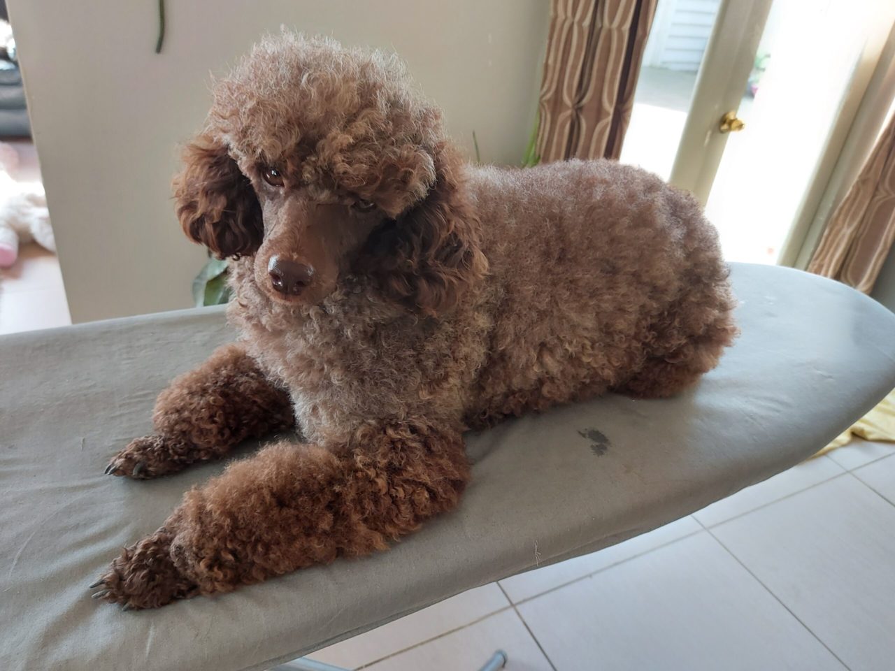 The most difficult clips are the first 2, as the dog is unused to clippers and will move around a lot so don’t panic if they have a hard time doing it. I use treats as positive reinforcement and an ironing board as the table to clip our poodles. The reason for the ironing board is that if the dog moves at all, the table wobbles and they instinctively sit down. Choose the cut you wish to replicate, then go for broke. I would suggest you start with a Poodle “puppy cut” or “lamb cut” and progress from there as you become more adept with the clippers.